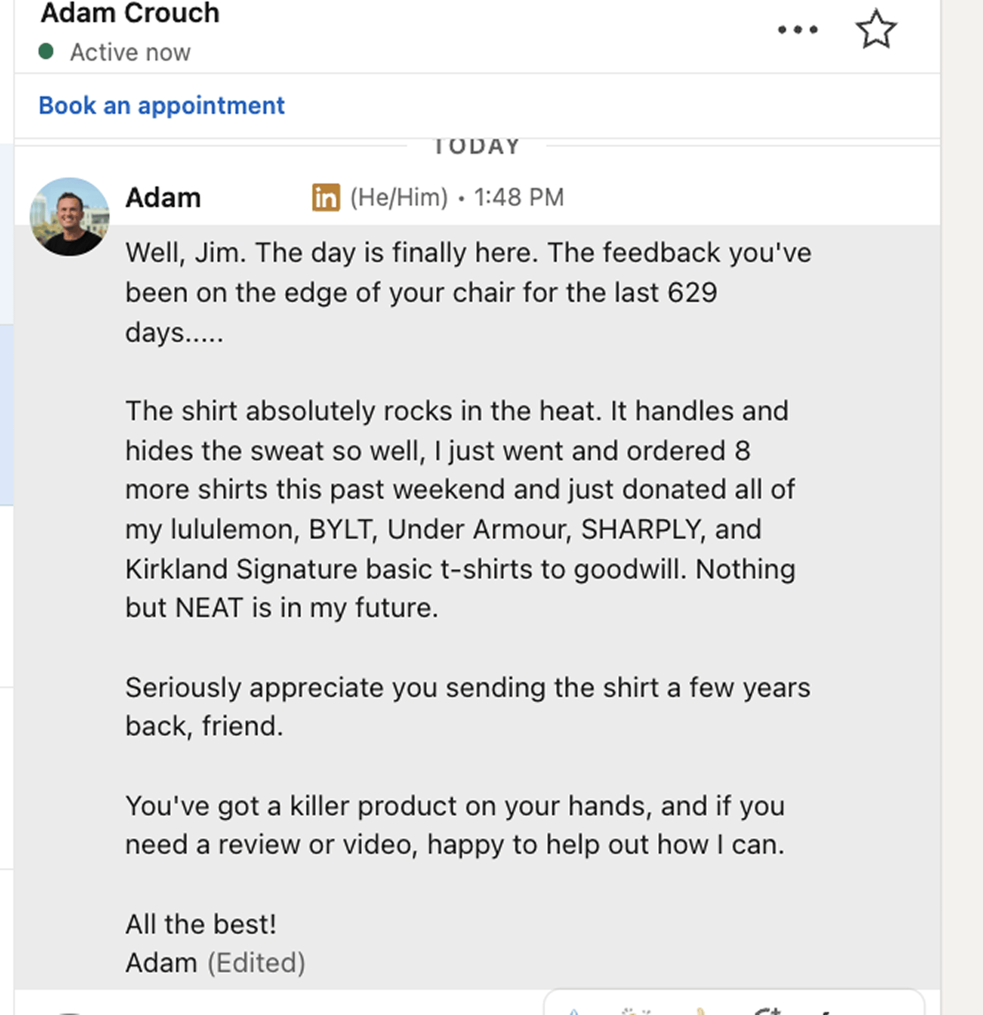 Some messages hit harder than any sales report. My friend Adam texted me from Phoenix: “Just ordered 8 more Neat shirts and donated all my Lululemon, BYLT, and Under Armour tees to Goodwill.” That’s the kind of product validation money can’t buy. When we bought Neat, that was the stretch goal: Not to make a shirt that competes with the big guys, but to make the shirt that replaces them. When someone who lives in 110° heat says yours wins? You don’t need another focus group.
